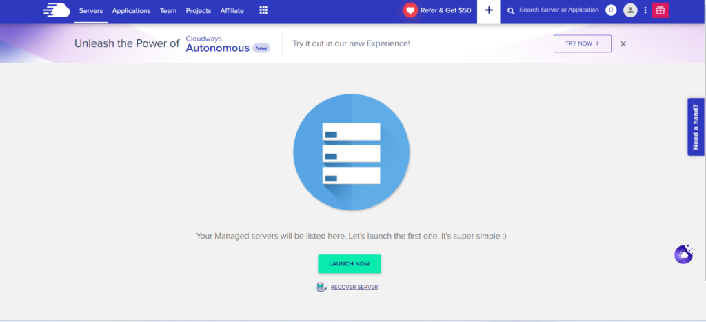 To kickstart the process of creating Rackspace Webmail, you’ll need to access the Cloudways Dashboard. If you don’t have a Cloudways account, sign up or Log in to start managing your hosting environment efficiently and proceed with the setup.